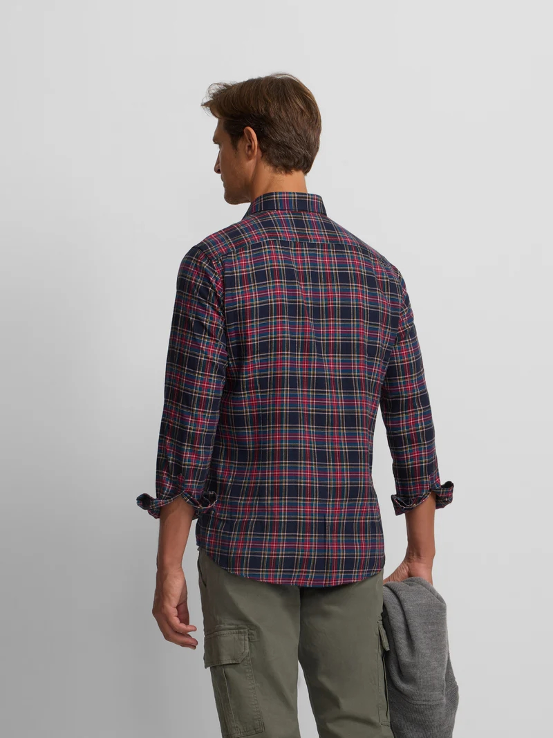 Camisa sport cuadro tartan bicolor confeccionada en 100% algodón BCI. Presenta cuello cutaway, cierre con botones personalizados y manga larga de puño con botones. Cuenta con raquetas bordadas a contraste en color azul marino en el torso.