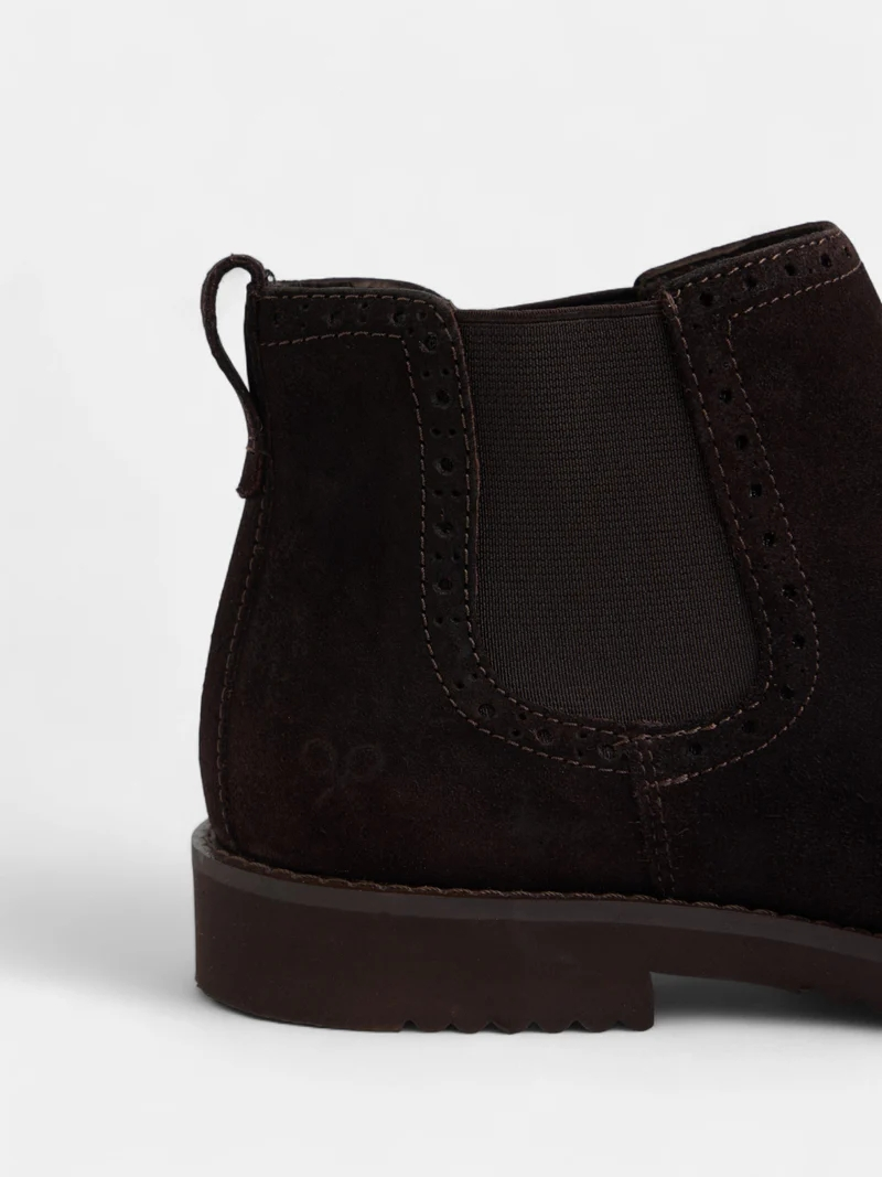 Bota tipo Chelsea en ante color marrón oscuro, de diseño clásico y elegante. Presenta los característicos paneles elásticos laterales que facilitan el calce, junto con una lengüeta trasera para mayor comodidad al poner y quitar. Confeccionada en piel de ante suave le aporta un aspecto refinado y versátil, ideal tanto para looks casuales como más formales. Presenta detalle de raquetas grabadas en la parte trasera. La suela de goma fina y flexible ofrece buen agarre y confort durante todo el día.