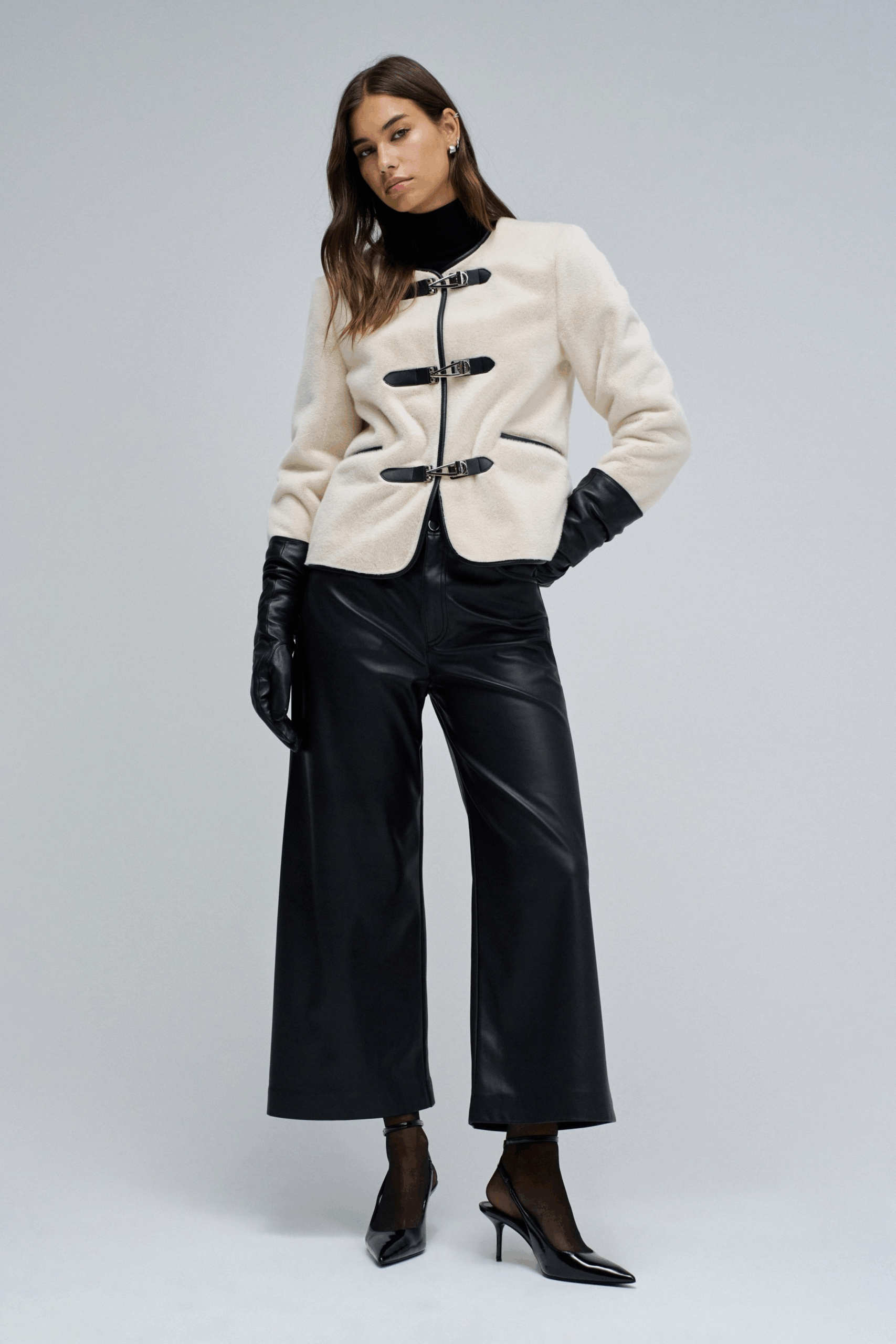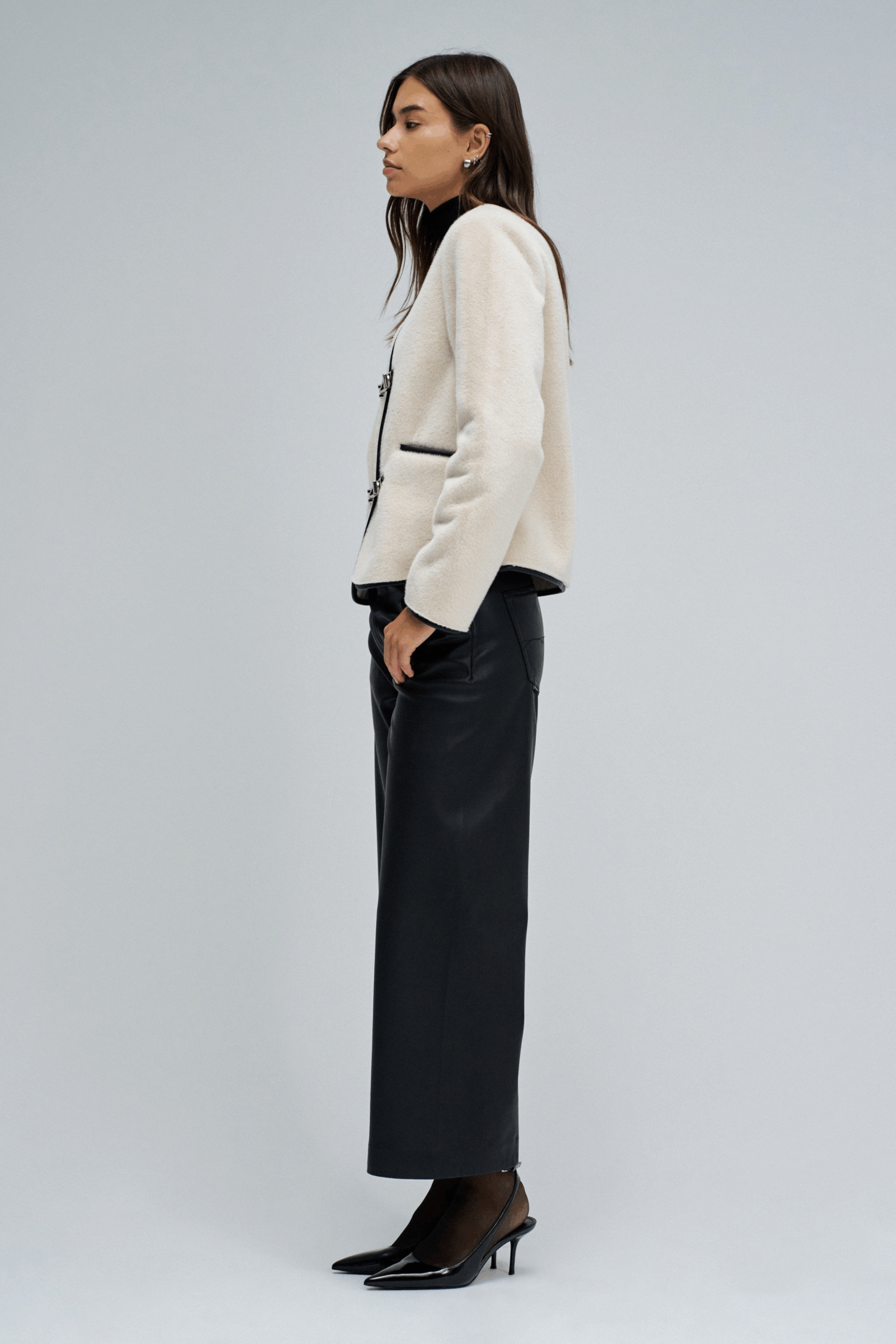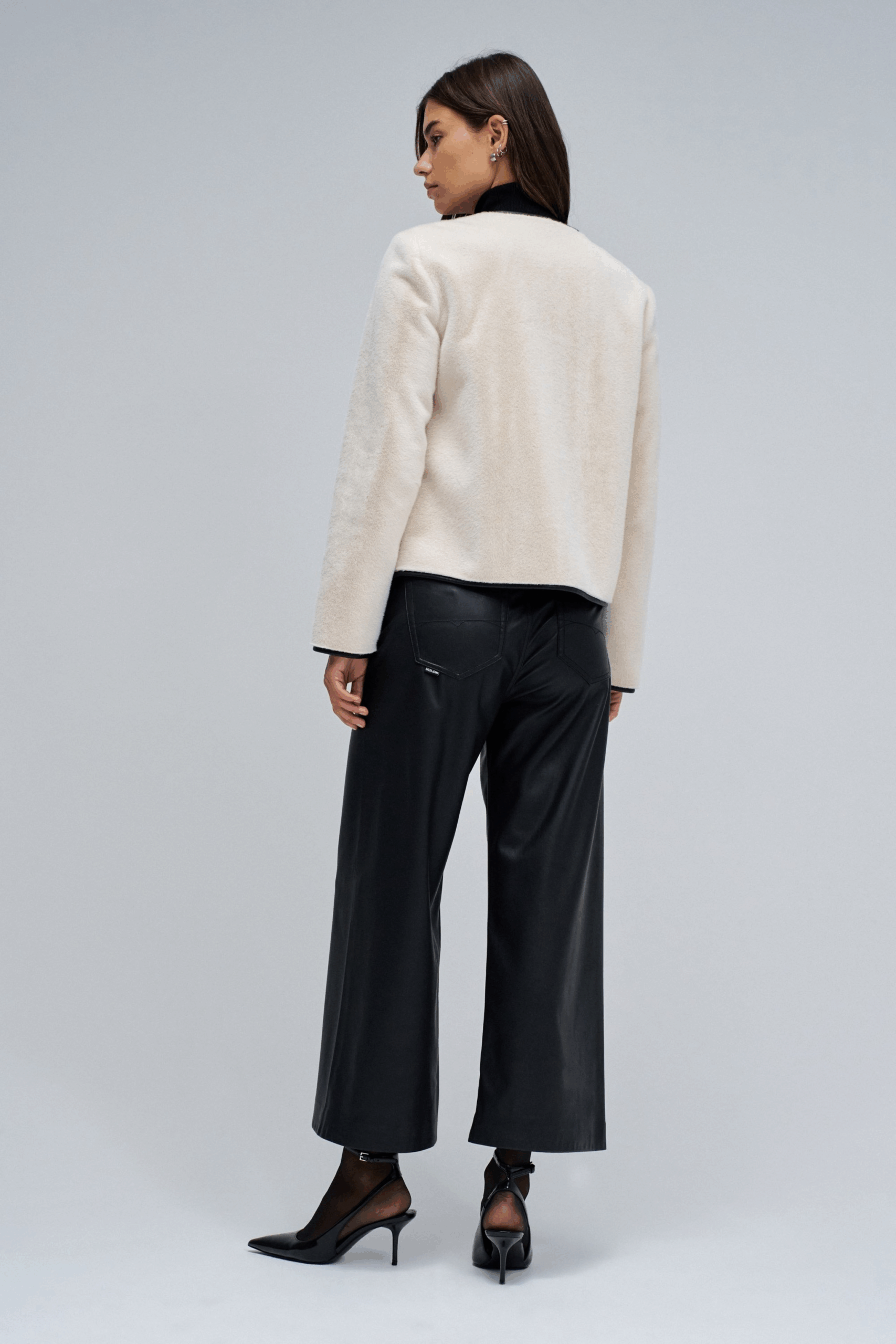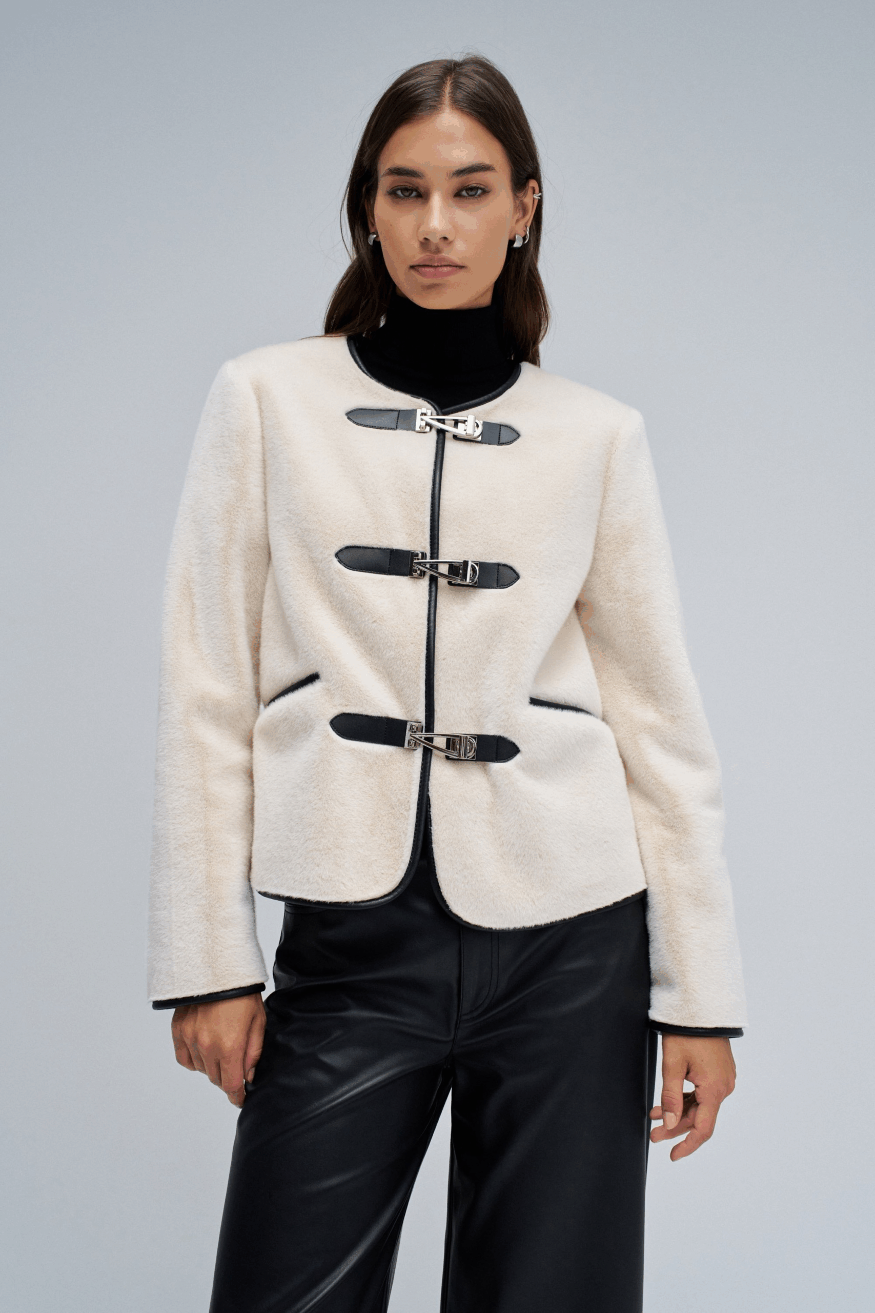 Esta chaqueta con pelo es un homenaje al confort sofisticado de los días fríos. De corte regular y cuello redondo, revela un equilibrio entre suavidad y estructura, con extremos en efecto piel que añaden contraste y sofisticación urbana. Los botones con gancho metálico en la parte delantera refuerzan el carácter distintivo de la prenda, mientras que los dos bolsillos discretos garantizan practicidad sin perder el encanto.Ideal para otoño-invierno, es el aliado perfecto para superponer a jerséis finos o blusas elegantes, creando combinaciones que combinan textura y elegancia. Completa el look con pantalones de efecto piel o vaqueros oscuros para un estilo urbano y casual chic.