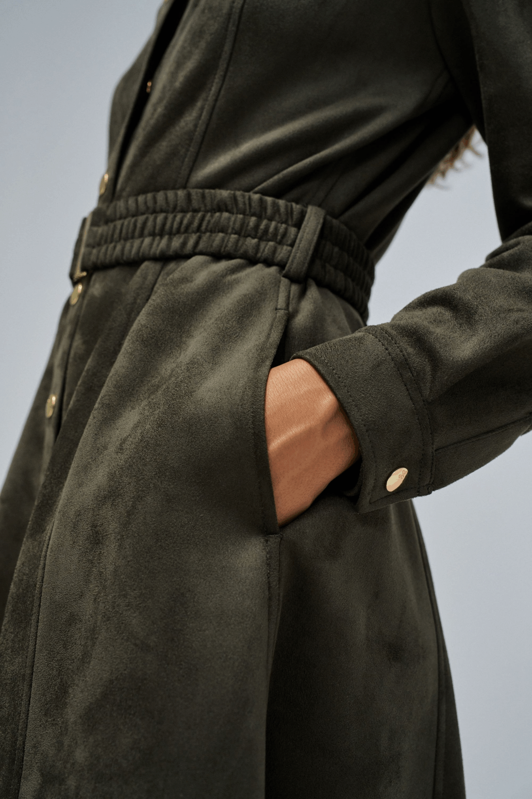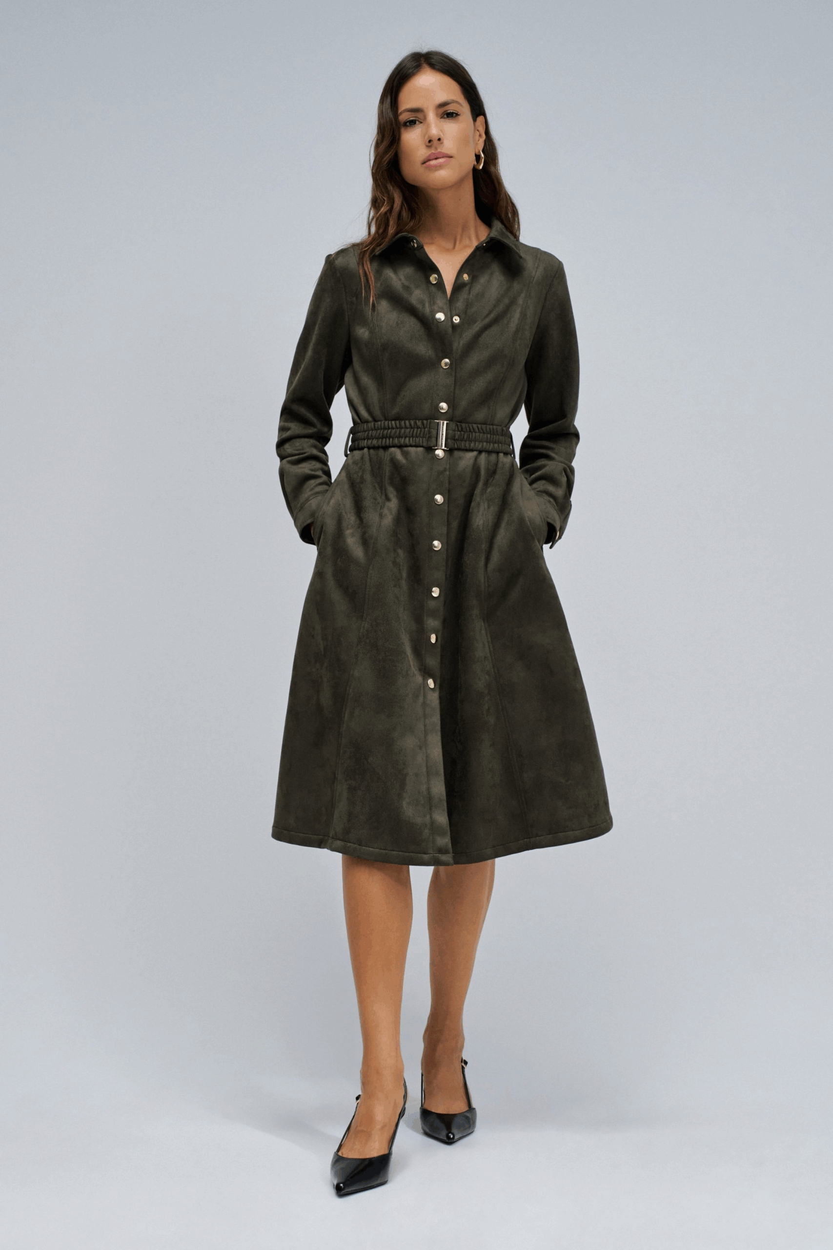 Este vestido midi en ante verde musgo traduce la calma sofisticada del otoño, donde la comodidad y la elegancia caminan juntas. La tela suave al tacto se desliza con ligereza en cada movimiento, mientras que el cinturón ajustable define la cintura de forma sutil y femenina. La abertura frontal con botones dorados añade un brillo discreto, que contrasta de forma exquisita con la profundidad del verde. Con mangas largas y cuello clásico, es una prenda versátil que se reinventa entre lo casual y lo sofisticado. La elección perfecta para combinar con botas altas y completar con la capa ideal: abrigos estructurados.