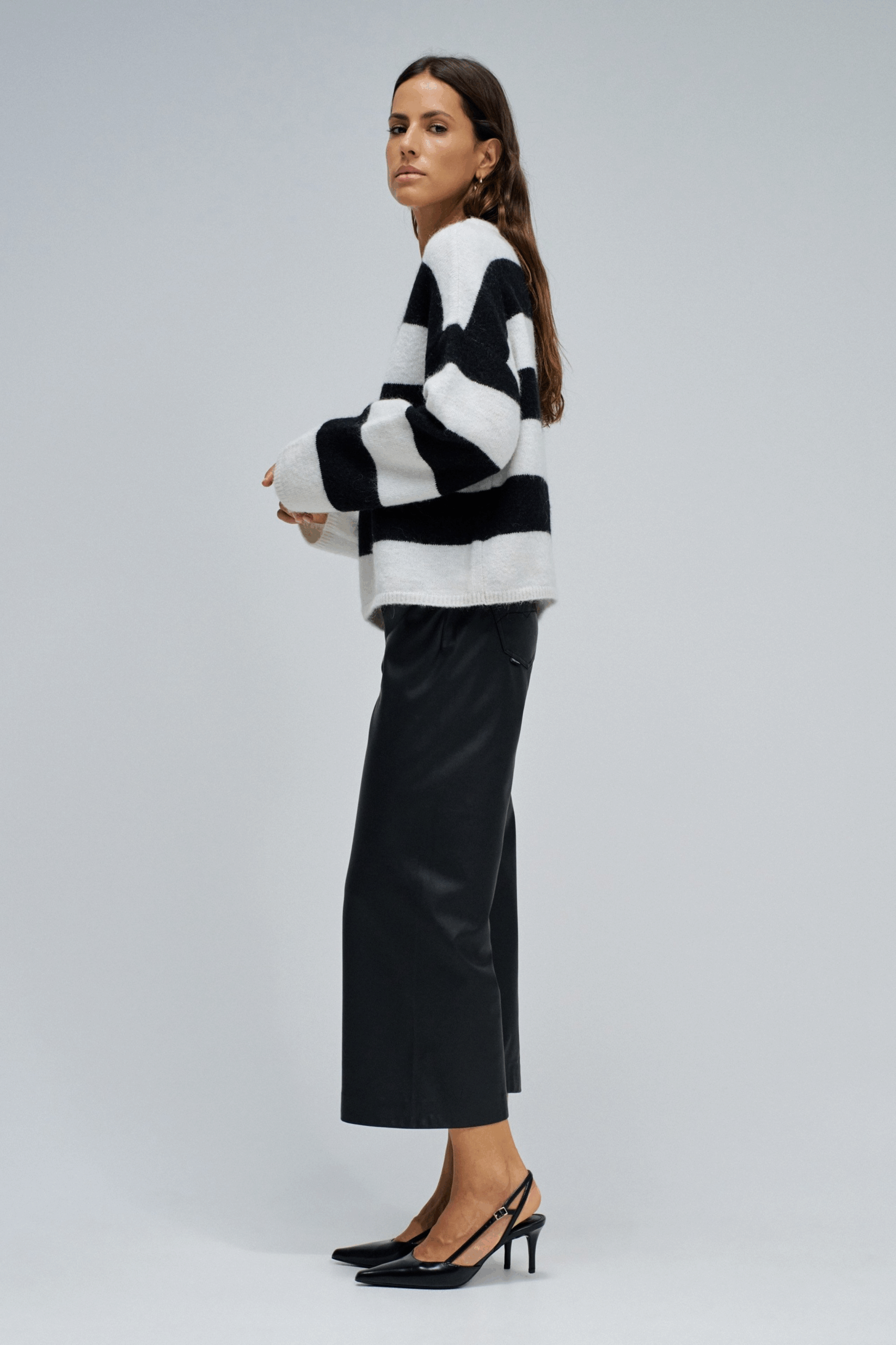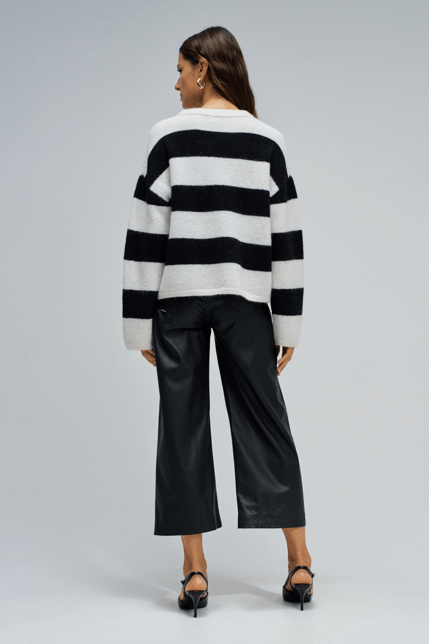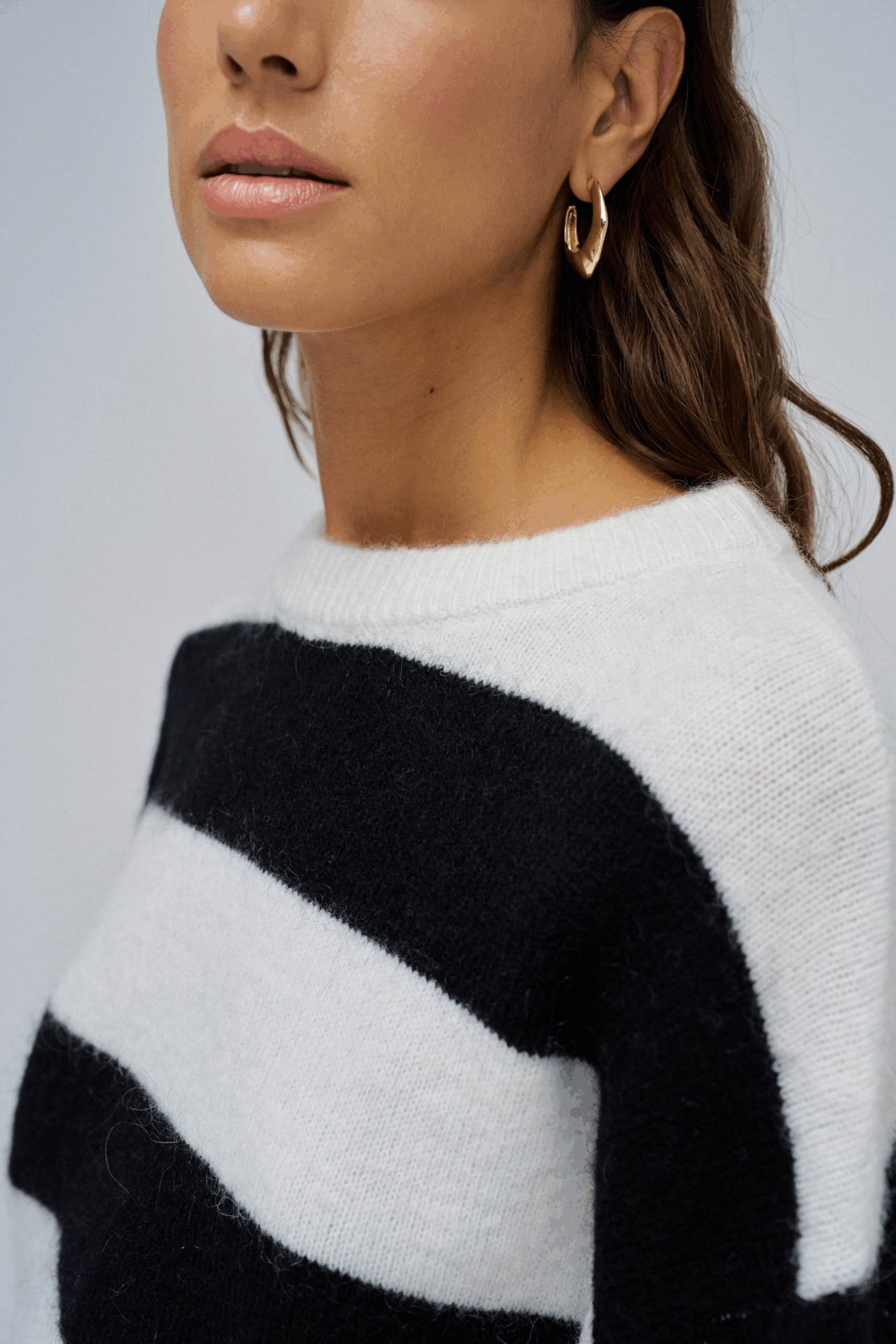 Jersey de mezcla de lana y mohair, suave y acogedor, que combina comodidad y estilo en un diseño atemporal. El estampado a rayas en blanco y negro añade un toque moderno y versátil, mientras que el cuello redondo y el corte regular garantizan una silueta relajada y fácil de llevar en cualquier ocasión. Una pieza esencial que eleva los looks del día a día con elegancia simple y natural.