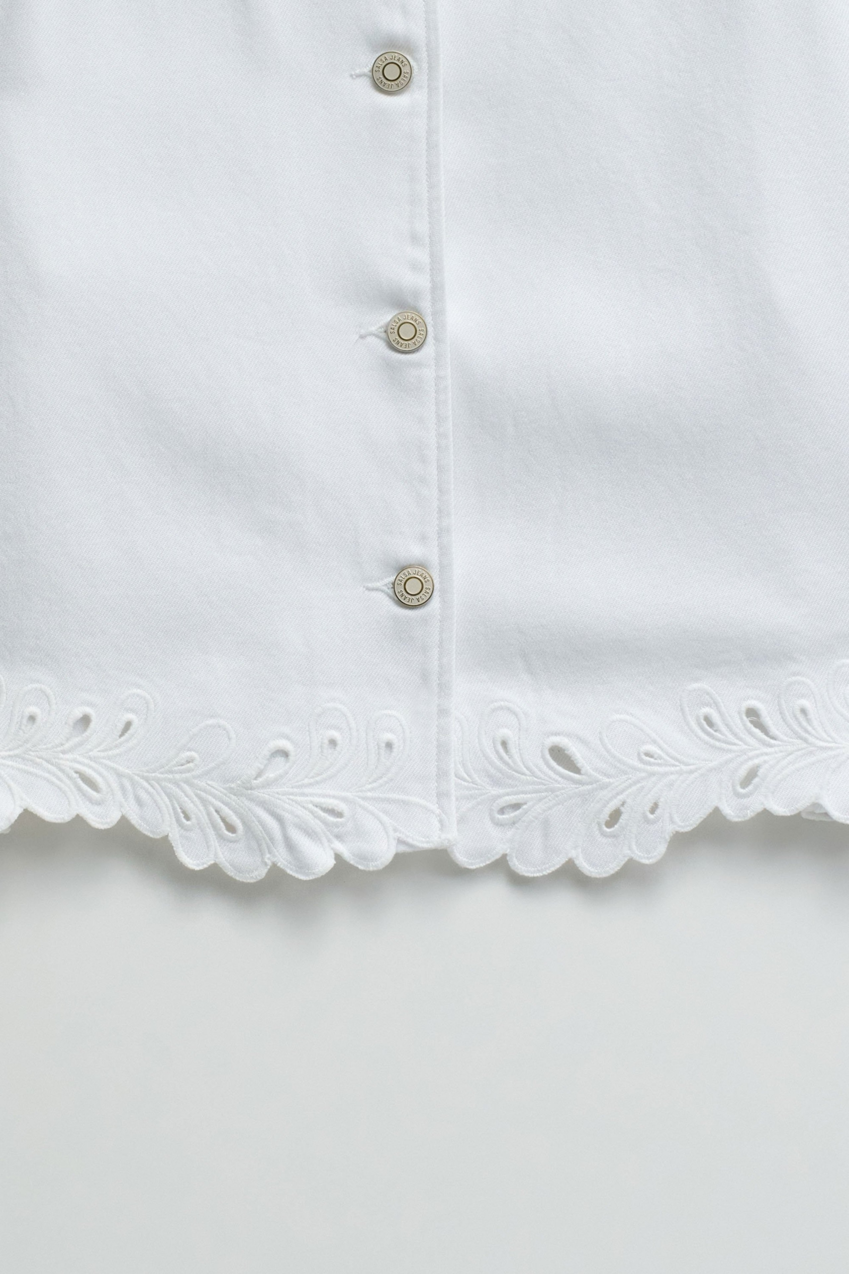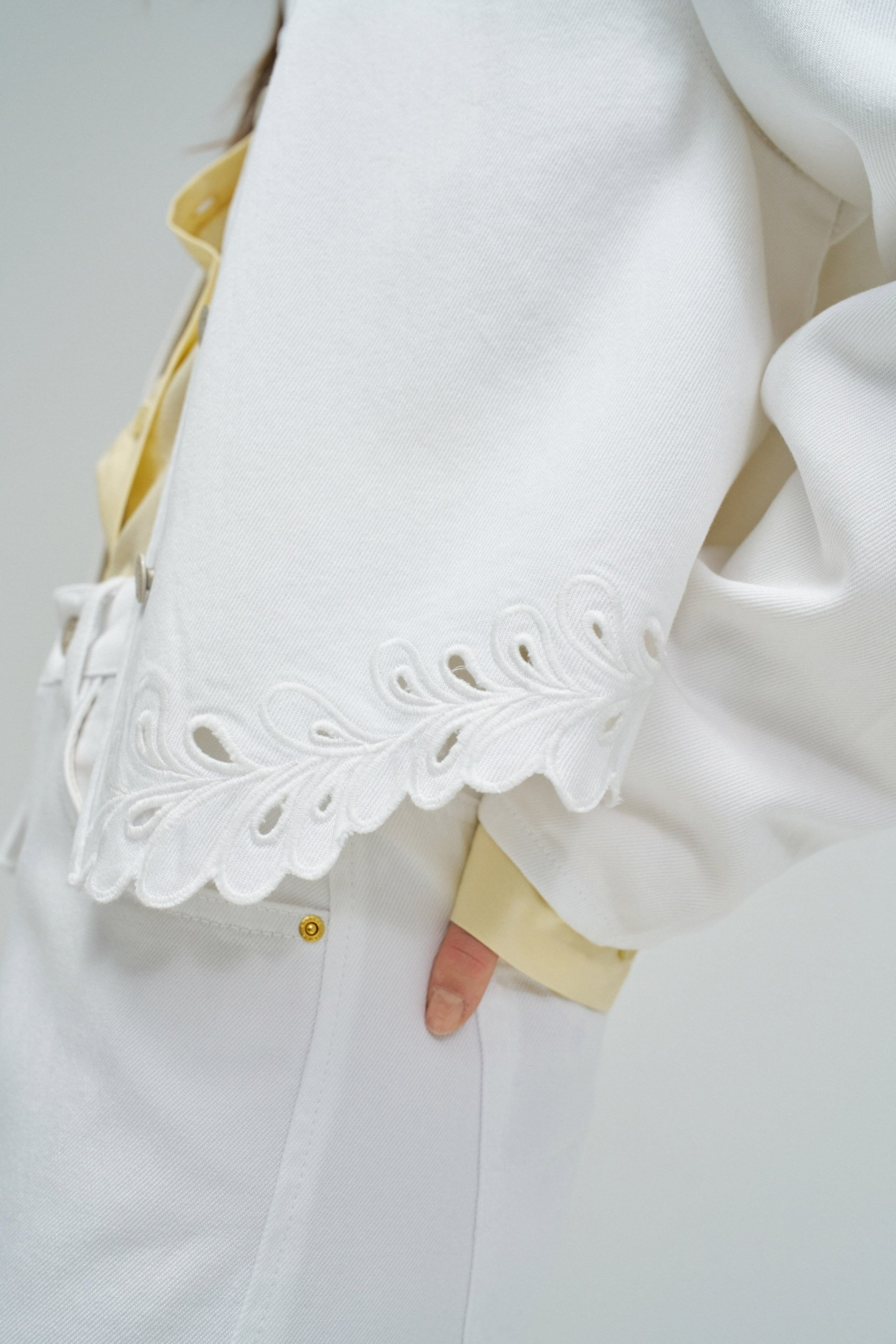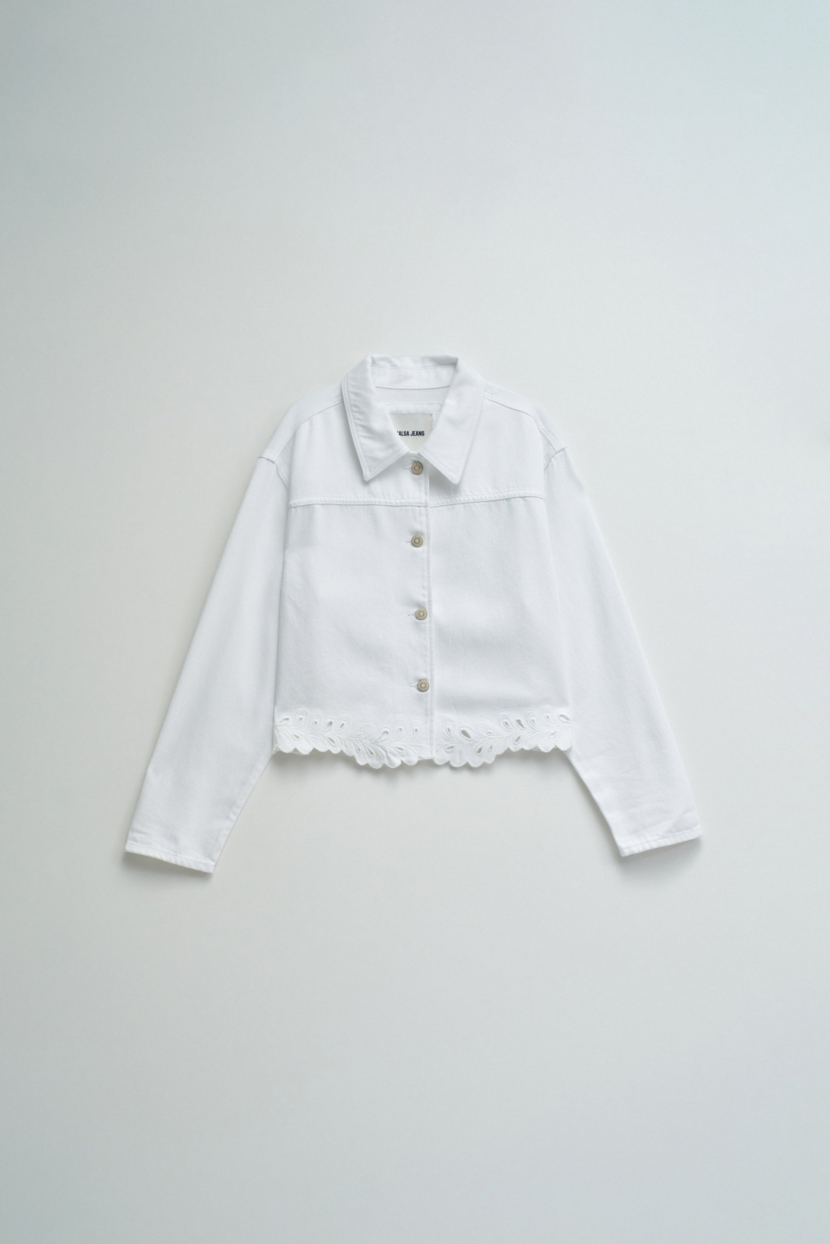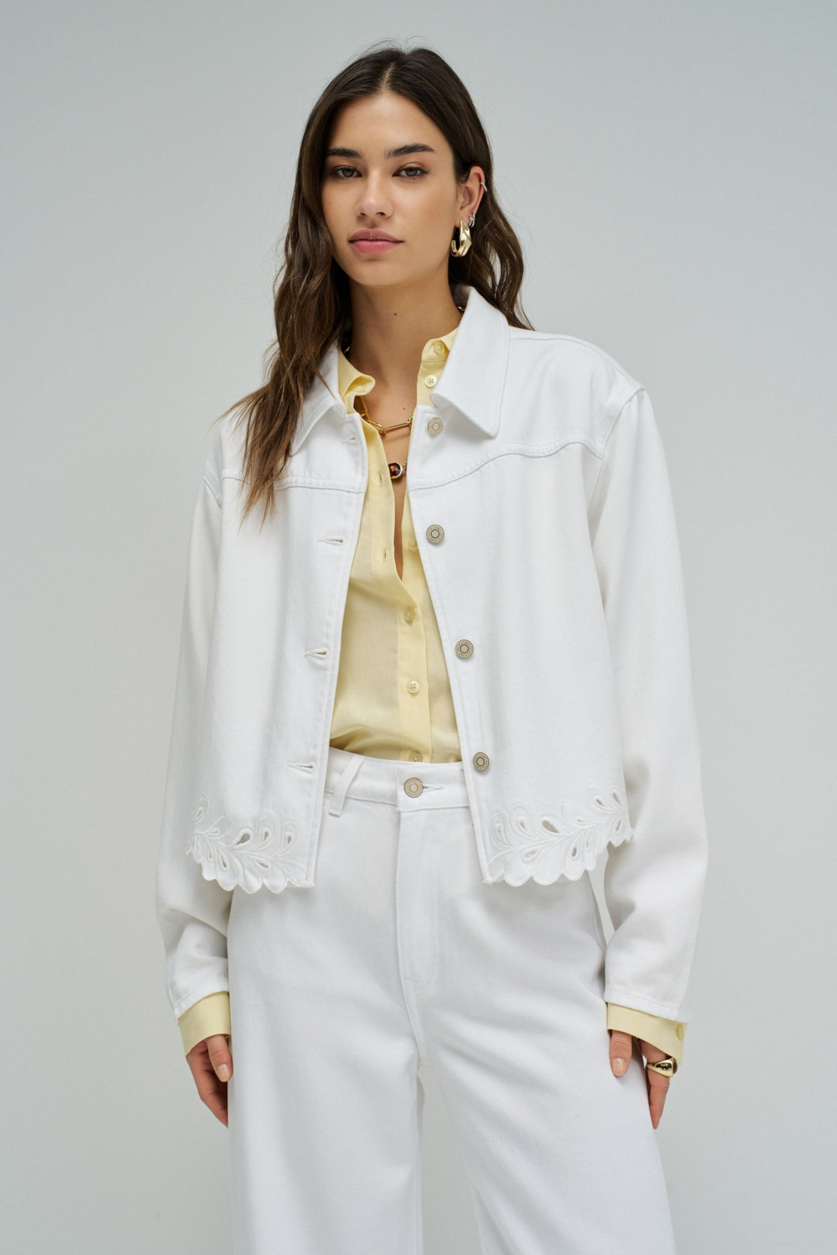 En lightdenim blanco, esta chaqueta reinterpreta la prenda utilitaria con un enfoque delicado y luminoso. El fit loose crea una silueta relajada y actual, perfecta para superponer sin peso. El escote con cuello y la apertura frontal con botones mantienen la inspiración clásica, mientras que el bordado en la parte inferior frontal añade un toque sutil y femenino. Las mangas largas equilibran la fluidez de la forma, haciéndola ideal para usar sobre vestidos ligeros o con coordinados en tonos suaves. Una prenda pensada para acompañar días claros, donde las capas son ligeras y los detalles marcan la diferencia. Combina con los Vaqueros wide leg en el mismo tono para un look simplemente irresistible.
